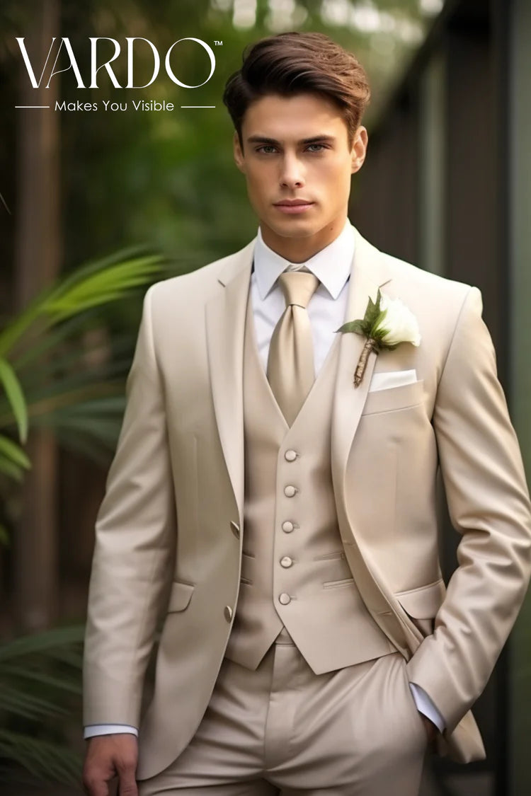 Chic Champagne Men's Three-Piece Suit - Sophisticated Business and Formal Attire