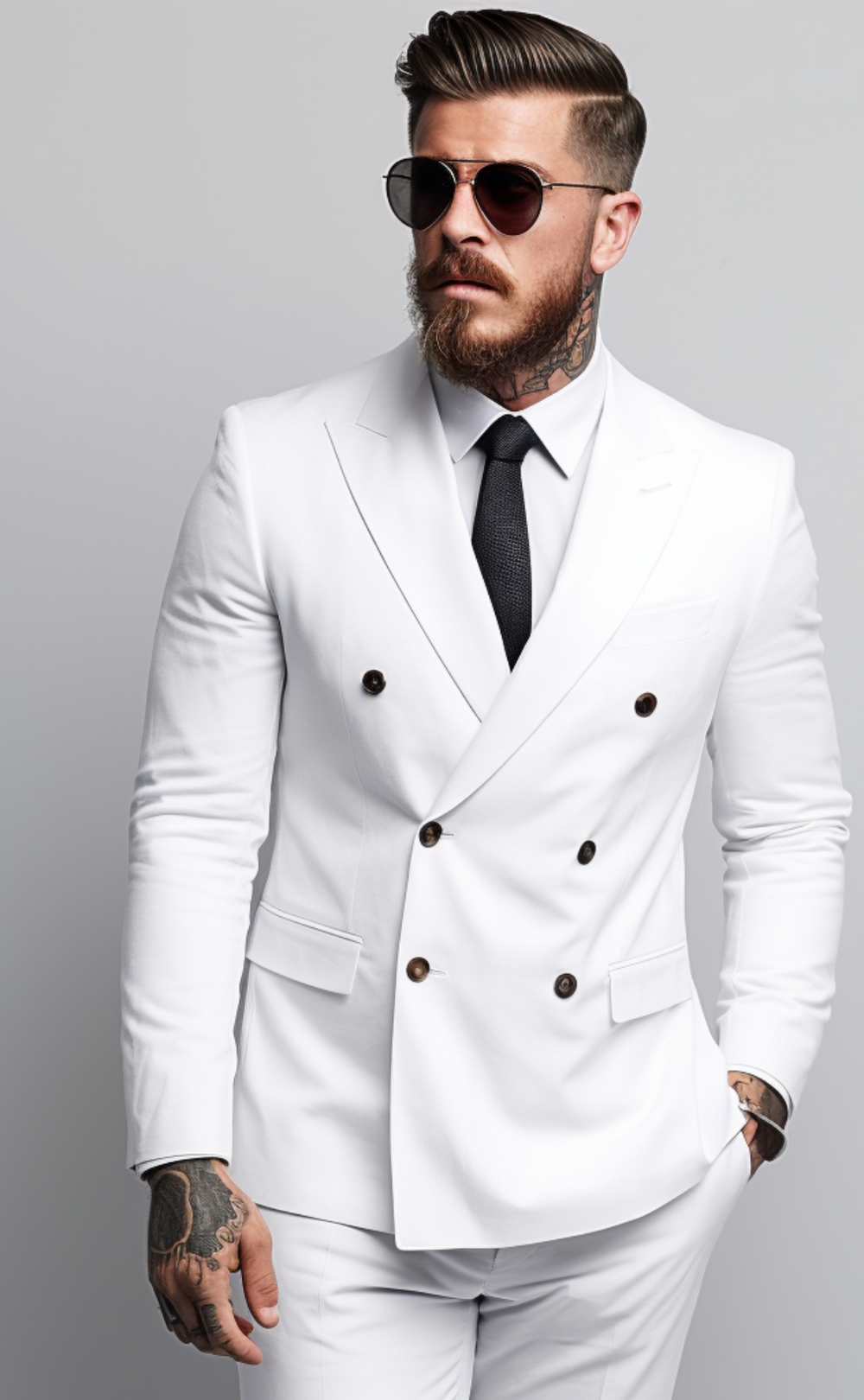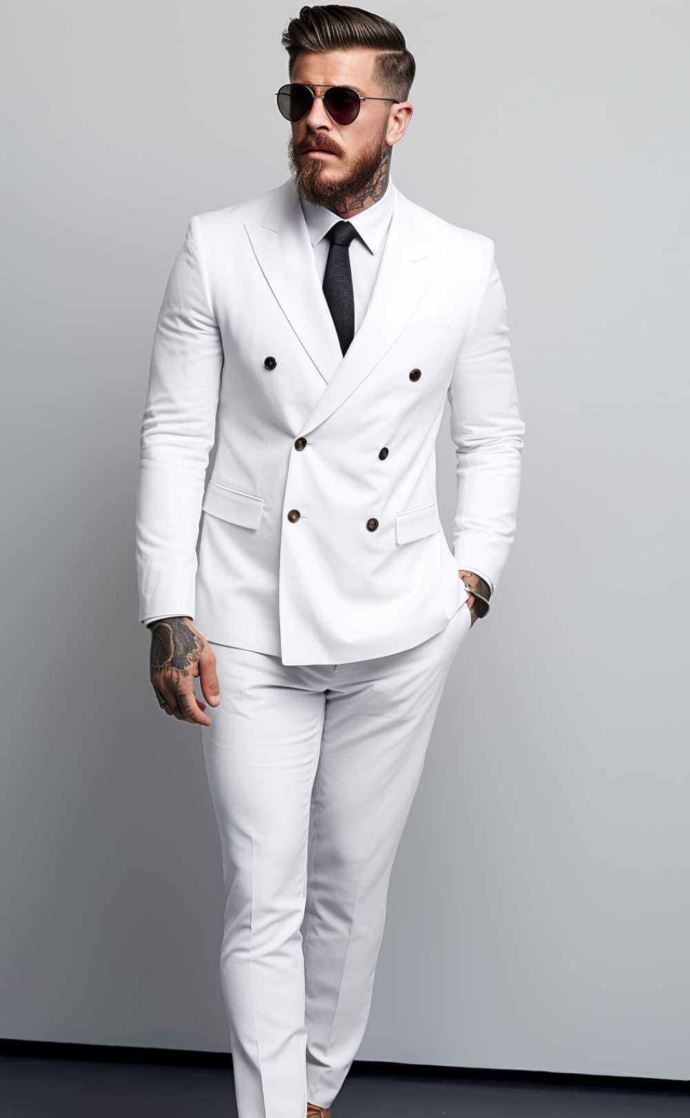 Stand out from the crowd, and wear your suit with confidence. Get ready to impress at every occasion, from business meetings to weddings. Make a statement, be unforgettable. #ElegantMenswear #FormalFashion #DoubleBreasted #WhiteSuit #TailoredFit #ModernClassic